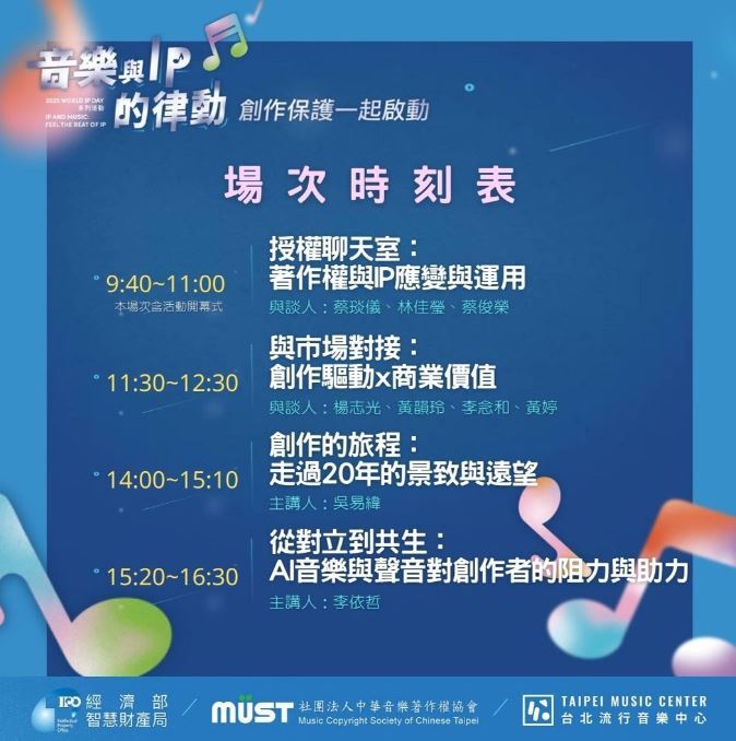 【活動轉知】經濟部智慧財產局於114年4月29日舉辦「音樂與IP的律動 創作保護一起啟動」系列講座活動。(2025.04.14)